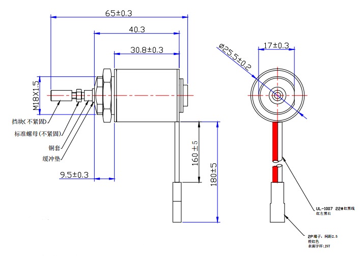 圖解:圖中標注了電磁鐵的結構組成已經尺寸,如果您要求的尺寸和上述要求不同,請您來電洽談,我們會根據您的要求定制您需要的尺寸和需要的性能。